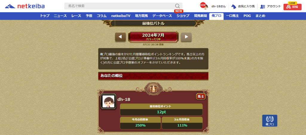 2024年7月3週時点の状況 俺プロ X Facebook はてブ LINE コピー 2024.07.27 最強位バトルにおいて獲得段位ポイントは12pt、今月の回収率250%、3ヶ月回収率111%で順位は3位となっている。最終週は10レース予想予定。